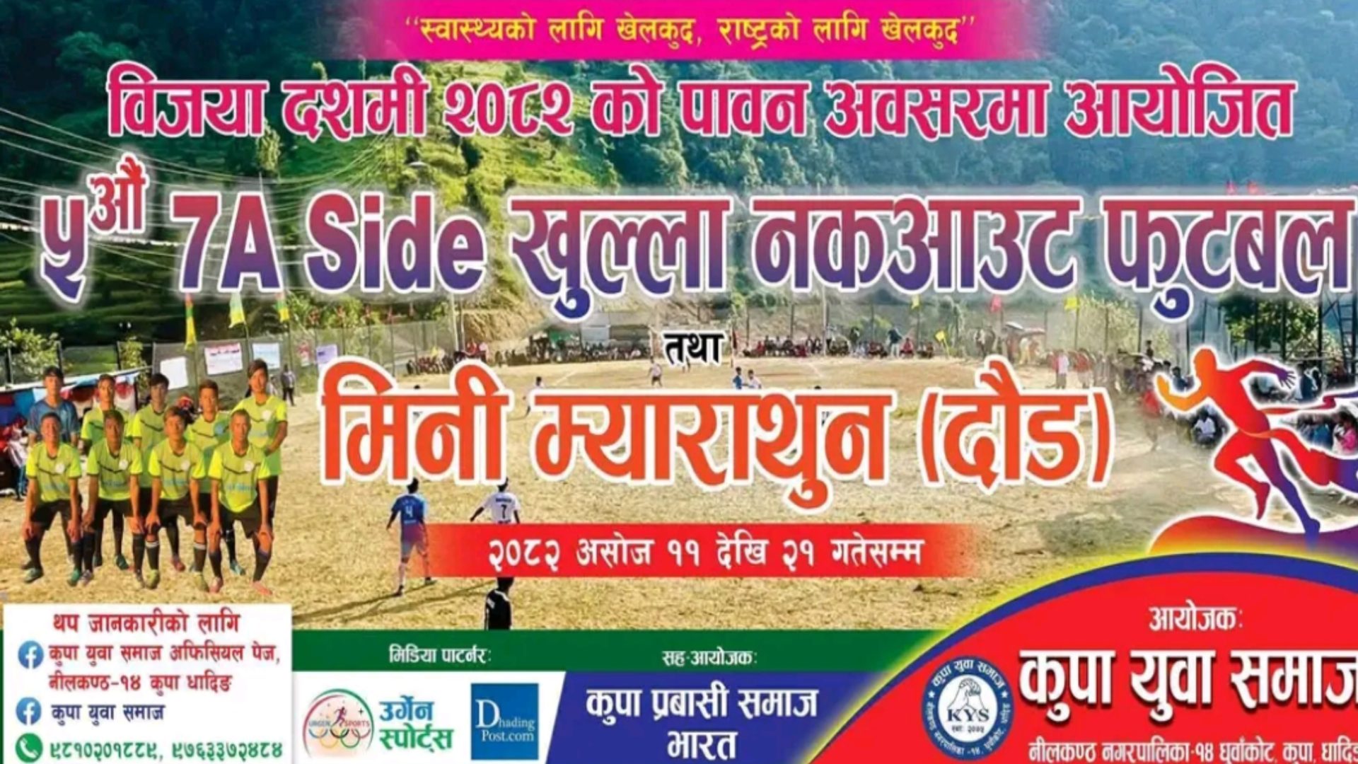 धादिङ जिल्लाको नीलकण्ठ नपा -१४ स्थित कुपा खेलमैदानमा जारी पाँचौं कुपा खुला नकआउट फुटबल प्रतियोगिताको फाइनल खेल आज असोज २१ गते मंगलबार हुनेछ।